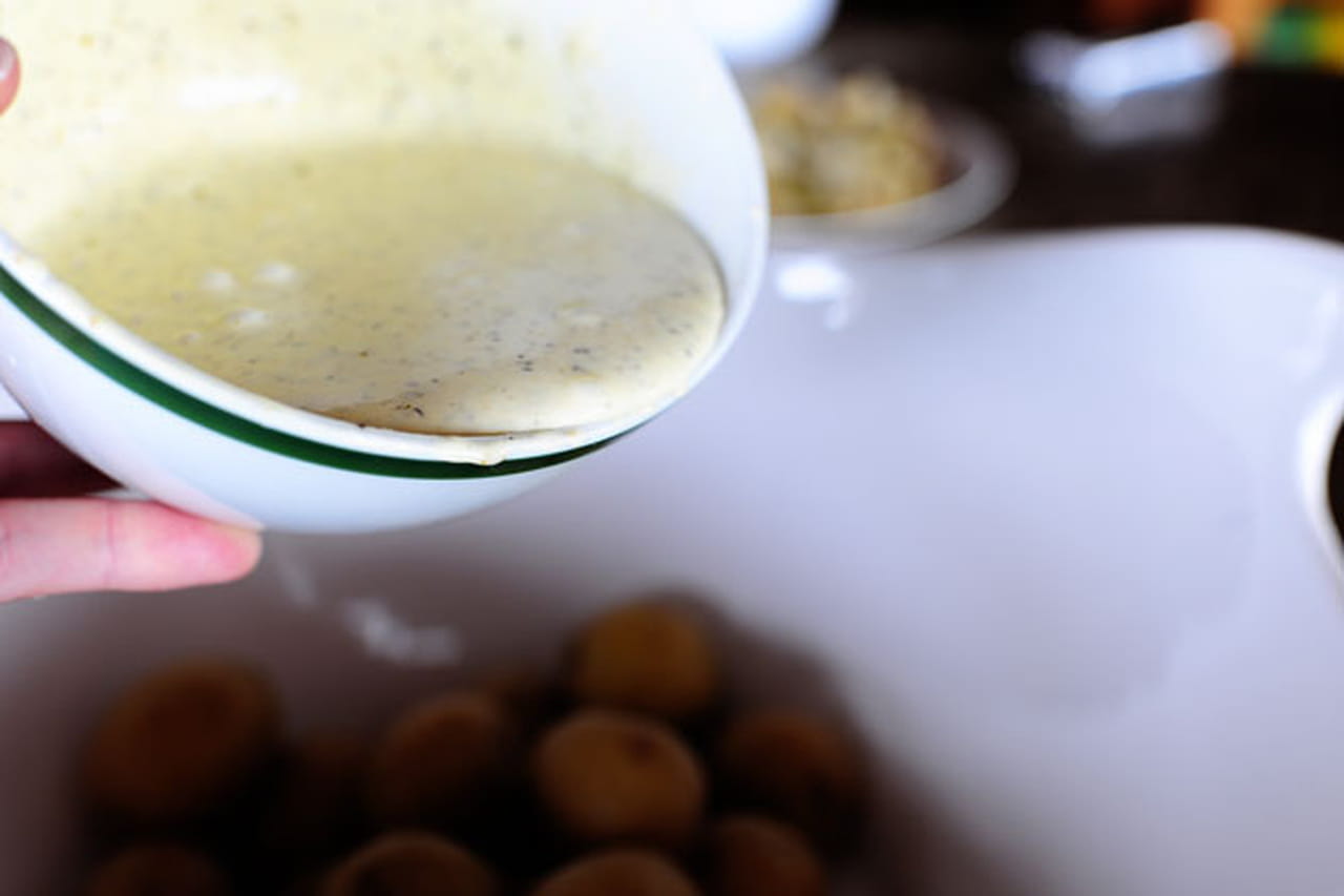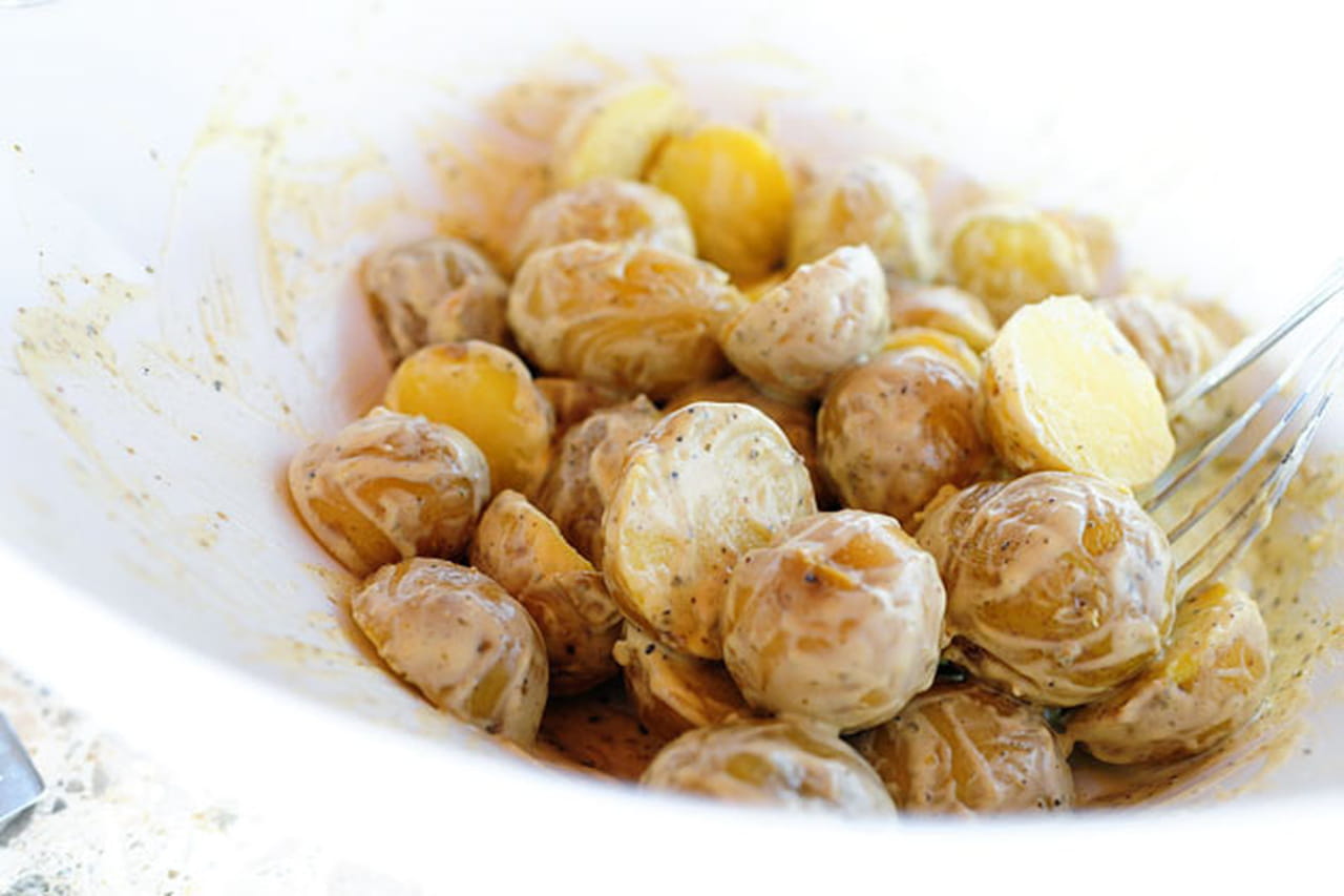 - أضيفي الصوص المجهز الي حبات البطاطس المبردة وقلبي جيدا .